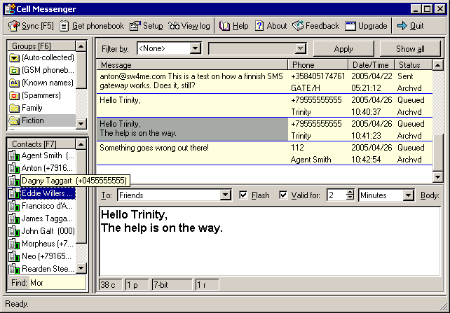 Cell Messenger lets you send, receive and archive SMS messages from your mobile phone. It provides support for reading your mobile's phonebook, sending group messages, anti-spam SMS filtering, unicode and multipart SMS messages.