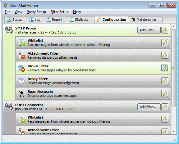 CleanMail is a complete SMTP/POP3 email security solution (Anti-Spam/Anti-Virus) that works with any mail server like Microsoft Exchange 2003/2007/2010, Microsoft Small Business Server (SBS) 2003/2008, Lotus Notes/Domino or IMail. CleanMail includes a comprehensive set of filters, including an attachment blocker, remote blacklist filter (DNSBL), and a complete Windows build of the award-winning, open-source SpamAssassin filter.