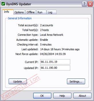 I hate this thing. The window cannot be resized, the interface is more convoluted than it needs to be, and for some strange reason, it displays my LAN IP as the "Current IP" and the "Updated IP" in the log (whereas on the Info tab, it shows my WAN IP as the "Current IP", and the LAN IP as the "Updated IP").