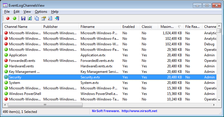 EventLogChannelsView is a simple tool that shows the list of all event log channels on your system, including the channel name, event log filename, enabled/disabled status, current number of events in the channel, and more. It also allows you to easily make some actions on multiple channels at once: enable/disable channels, set their maximum file size, and clear all events stored in the channels.