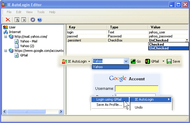 IE AutoLogin is an Internet Explorer Web Password Manager that allows you to log into a Web site with one click. It is integrated with Internet Explorer and can be accessed from a toolbar that becomes a part of Internet Explorer, HTML page context menu or Internet Explorer main menu. IE AutoLogin Web Password Manager saves all login information from Web forms as your profile to a protected location on your computer and completes and submits login forms the next time you select this profile. It allows import of Internet Explorer AutoComplete usernames and passwords.