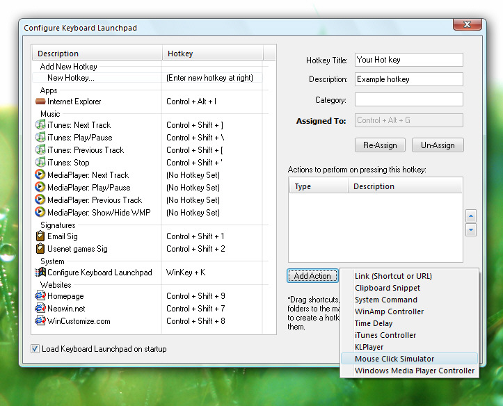 Keyboard Launchpad (KLP) allows you to quickly and easily assign hot keys to launch programs, visit URLs, paste saved clipboards, control individual programs, perform system commands, and more. What makes it special is that it works system wide. No matter what program you're in, no matter what you're doing, you can always access the hotkeys. It also has an open plugin format so that if there is a specialized program you wish to add your own hot key support to, you can do so.