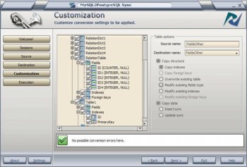 MySQL2PostgreSQL Sync supports Unicode that allows you to make language special symbols displayed correctly. The program gives a user an opportunity to select a table type: MyISAM, HEAP, BDB or ISAM. Significantly improved Usability, Brand, Design and Changeable Skins are supplemented with Multilanguage support. The current version converts Primary keys and Indexes. Renaming of tables, fields, indexes before synchronization is also available. Sessions support allows you to save all your settings and restore them afterwards.