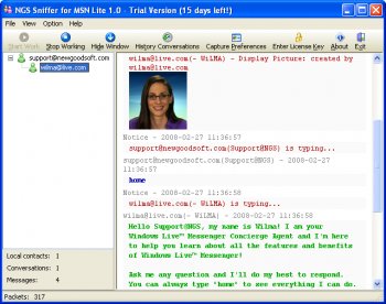 NGS Sniffer for MSN is a new and good software for sniffing MSN traffics. It provides two major functions: one is a MSN sniffer and monitor, the other is a MSNP protocol analyzer. Captures/Blocks MSN conversations on your LAN. Recognizes not only plain text messages, but also P2P Via Server messages, such as custom emoticons and display pictures(user tile). Shows all the events of MSN contact, e.g. signed in, signed out, changed personal message, playing medias, and so on.