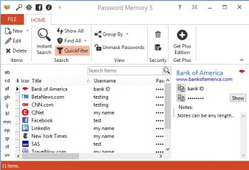 Password Memory helps you organize and secure your passwords. You passwords are encrypted using multiple algorithms to keep them secure. Your login details (username, password, etc.) can be searched and sorted fast easily. Login details associated with a website can also be copied into the webpage with the click of a button. It can even keep track of your credit card information for secure and fast access.