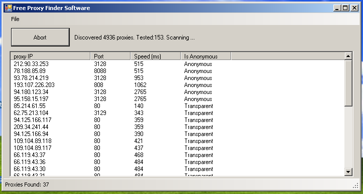 Proxy Finder Software will automatically find proxy servers from several well known public sites. Application also verify proxies, as a result you'll have only fresh alive proxy list. Proxy finder software is very fast, you'll obtain more than 200 fresh alive proxies just in several seconds (Note, this depends on you internet connection speed).