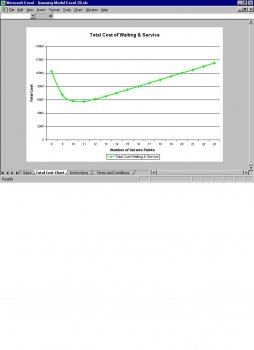 Queuing Model will calculate the optimum number of customer service points (staff) to minimize costs for your business. It considers the average arrival rate of customers, the average customer service rate, the cost to the business of customer waiting time (customer dissatisfaction), and the cost to operate customer service points. Queuing models are used extensively in call centers, toll booth operations and situations where a there is a queue for service including, counter staff, service staff, call response staff or maintenance staff. They can be applied in any business providing a customer service function. The model will calculate the optimum number of service points and allow you to test alternatives by manually inputting service point numbers. Additional results include the average number of customers waiting in the queue, their average waiting time, and service point (staff) utilization. The Total Cost Chart plots total cost verses number of service points to display the impact of changes in service point numbers.