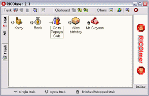 RICOlmer is a task reminder/scheduler. It can send e-mails (as remind event), launch programs, documents etc., shutdown/logoff system. With very easy definition of task repetition almost every combination is possible. Can be used as an alarm clock by playing sounds repeatedly. It's small, intuitive, useful, the interface is clear and not too confusing (can reside in system tray). If you use it, you will never forget about your mother-in-law's birthday.