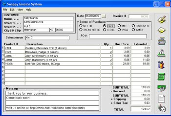 Snappy Invoice System is \dDesigned with ease of use as a primary feature, the friendly menu system will help you maintain Product and Customer Lists, quickly search for past documents, print useful reports, E-mail invoices to customers, and much more. A powerful, easy-to-use search wizard makes locating previous entries fast and easy. The built in Sales Journal feature will help you track how many sales where made during a certain period, monitor salesperson performance, and determine the total amount of sales tax collected for a given period. Sales tax is computed automatically, and you have the option to apply discounts and override data -- giving you complete control and flexibility when creating invoices and sales receipts.