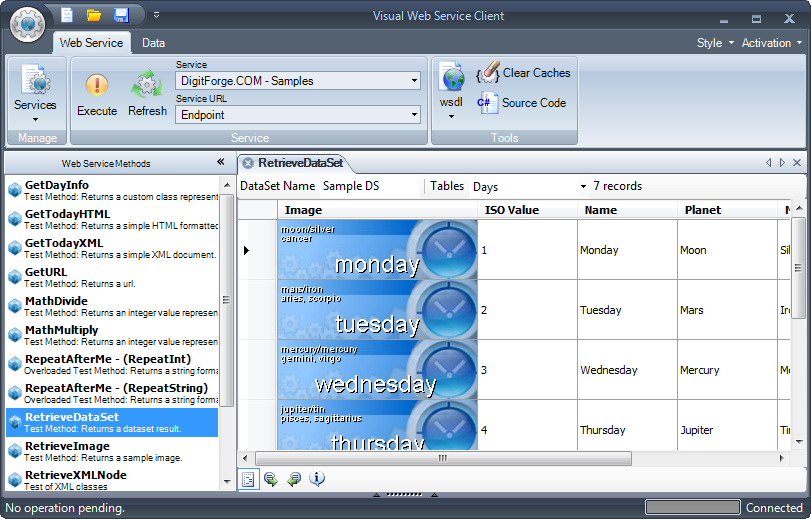 Visual Web Service is a stand-alone visual tool to interact with and manipulate any web service. Targeted to developers and IT professionals to test, maintain, and interact with web services. Ideal for 3rd party client validation, testing of web service features, and a stand-alone client. Visual tools mean you can be up and running immediately, with no special knowledge.