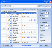 VolumeLock is an easy-to-use audio control utility that gives you the freedom in loudness control. With this program you can guarantee that the volume level of your PC will never be changed unexpectedly. By creating your own fully customized rules for any volume control you can prevent other applications from changing the volume suddenly. It includes a powerful lock function, a scheduler, command line support, an ability to store and retrieve a lot of rule configurations via one mouse click or system-wide hot keys. It works with all modern sound cards and can be useful for home and power users alike.