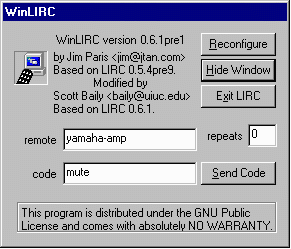 WinLIRC allows you to transmit and receive standard infrared remote control signals. This allows you to control your computer using almost any standard infrared remote control. It also allows your computer to control other equipment which uses these signals (stereo equipment). It is the Windows equivalent of LIRC, the Linux Infrared Remote Control program.