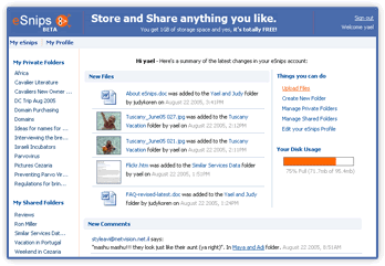 eSnips lets you snip, store and share anything you like. Up to 1GB of free storage for your Web research, files and photos.